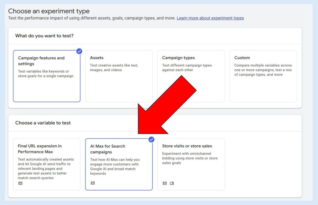 Discovered that Google has introduced a new experiment type for testing AI Max features in Search campaigns.