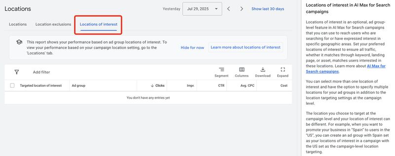 AI Max for Search campaigns now support Locations of Interest at the ad group level.